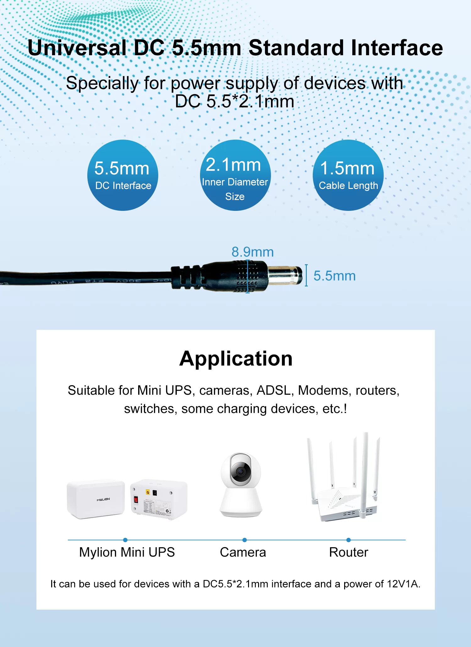 Applications | Mylion Mini UPS, lithium battery packs, security cameras, routers, other DC devices |